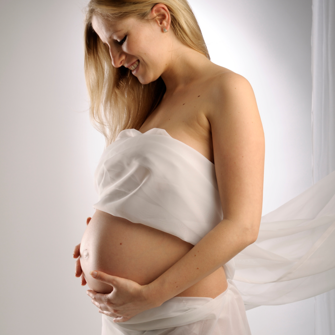Pregnant woman, happily holding her womb.